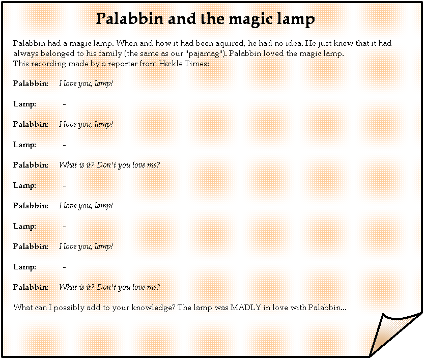 Palabbin and the magic lamp Palabbin had a magic lamp. When and how it had been aquired, he had no idea. He just knew that it had always belonged to his family (the same as our "pajamag"). Palabbin loved the magic lamp. This recording made by a reporter from Hækle Times: Palabbin: I love you, lamp! Lamp: - Palabbin: I love you, lamp! Lamp: - Palabbin: What is it? Don't you love me? Lamp: - Palabbin: I love you, lamp! Lamp: - Palabbin: I love you, lamp! Lamp: - Palabbin: What is it? Don't you love me? What can I possibly add to your knowledge? The lamp was MADLY in love with Palabbin... |
