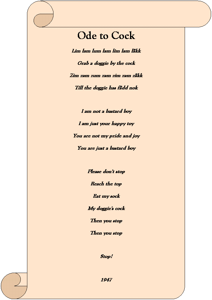 Ode to Cock Lim lam lum lam lim lam låkk Grab a doggie by the cock Zim zam zum zam zim zam zåkk Till the doggie has fådd nok