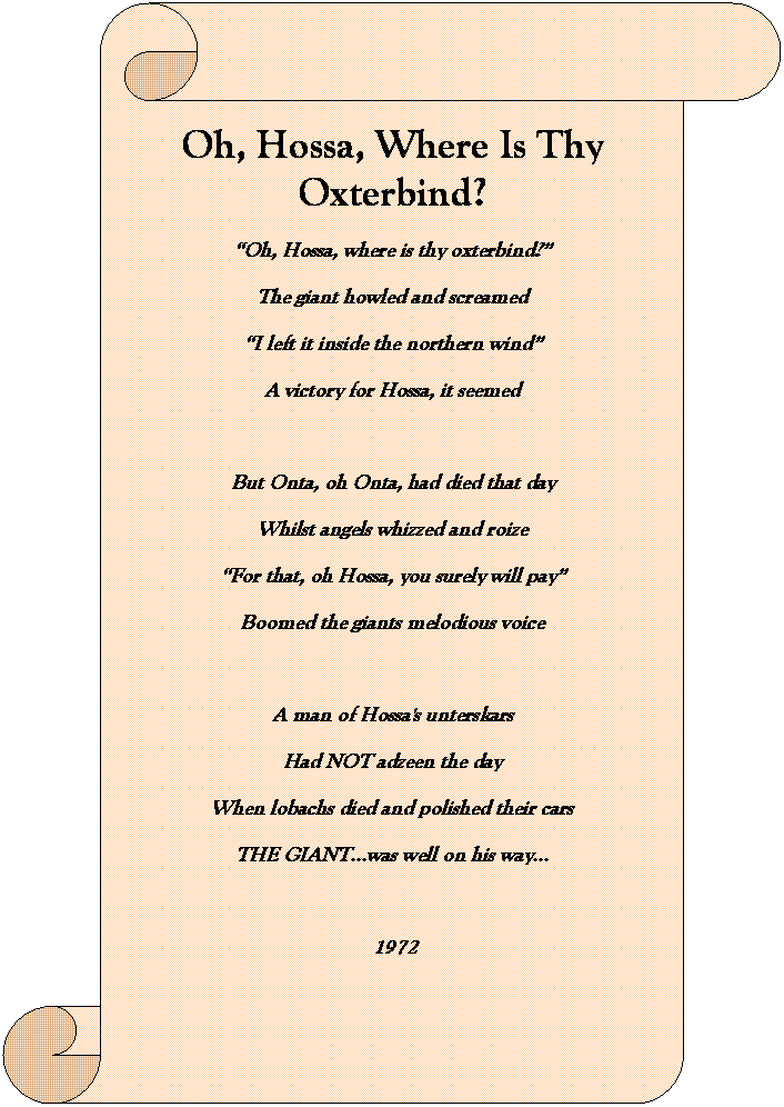 Oh, Hossa, Where Is Thy Oxterbind? “Oh, Hossa, where is thy oxterbind?” The giant howled and screamed “I left it inside the northern wind” A victory for Hossa, it seemed