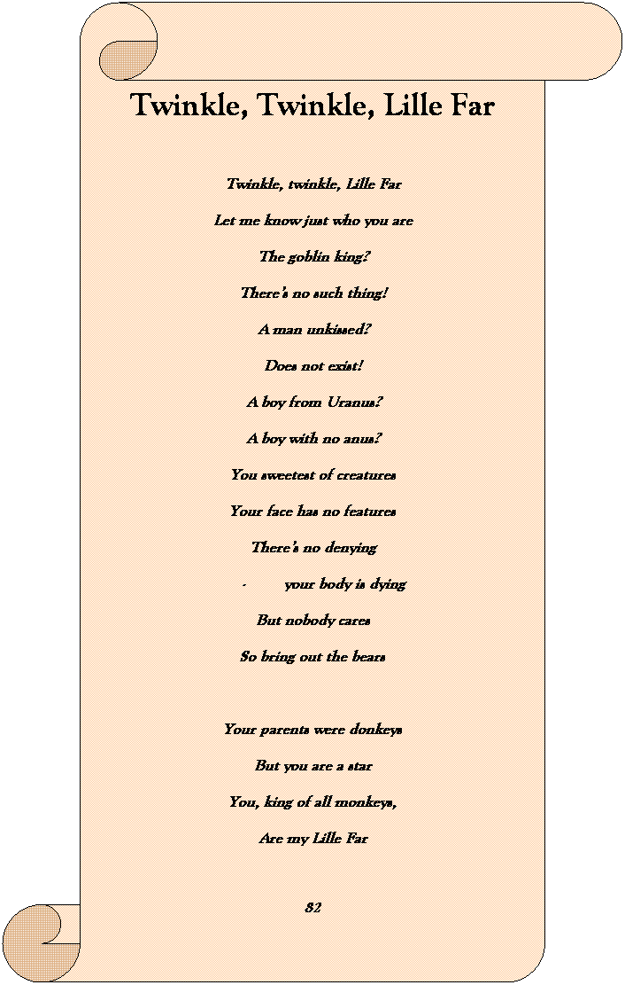 Twinkle, twinkle, Lille Far Let me know just who you are The goblin king? There’s no such thing! A man unkissed? Does not exist! A boy from Uranus? A boy with no anus? You sweetest of creatures Your face has no features There’s no denying - your body is dying But nobody cares So bring out the bears