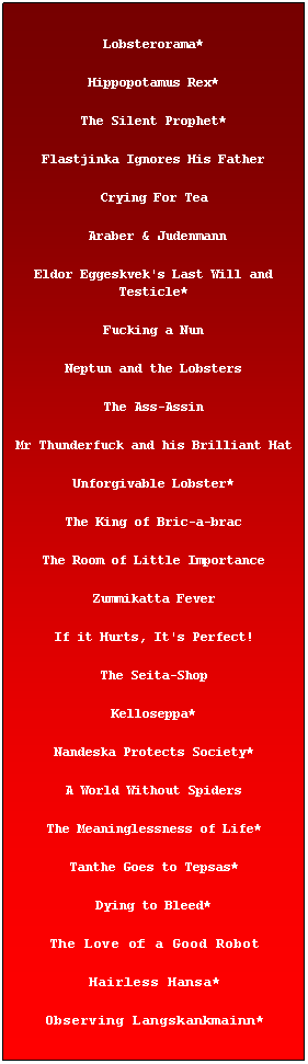 Lobsterorama* Hippopotamus Rex* The Silent Prophet* Flastjinka Ignores His Father Crying For Tea Araber & Judenmann Eldor Eggeskvek's Last Will and Testicle* Fucking a Nun Neptun and the Lobsters The Ass-Assin Mr Thunderfuck and his Brilliant Hat Unforgivable Lobster* The King of Bric-a-brac The Room of Little Importance Zummikatta Fever If it Hurts, It's Perfect! The Seita-Shop Kelloseppa* Nandeska Protects Society* A World Without Spiders The Meaninglessness of Life* Tanthe Goes to Tepsas* Dying to Bleed* The Love of a Good Robot Hairless Hansa* Observing Langskankmainn* |