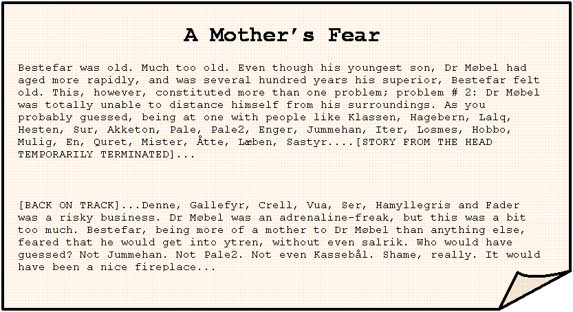 A Mother’s Fear Bestefar was old. Much too old. Even though his youngest son, Dr Møbel had aged more rapidly, and was several hundred years his superior, Bestefar felt old. This, however, constituted more than one problem; problem # 2: Dr Møbel was totally unable to distance himself from his surroundings. As you probably guessed, being at one with people like Klassen, Hagebern, Lalq, Hesten, Sur, Akketon, Pale, Pale2, Enger, Jummehan, Iter, Losmes, Hobbo, Mulig, En, Quret, Mister, Åtte, Læben, Sastyr....[STORY FROM THE HEAD TEMPORARILY TERMINATED]...