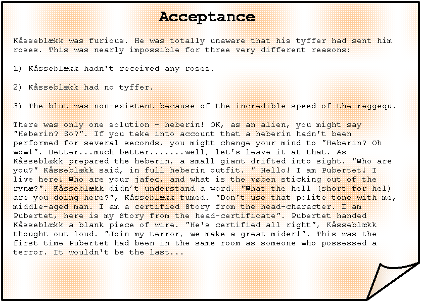 Acceptance Kåsseblækk was furious. He was totally unaware that his tyffer had sent him roses. This was nearly impossible for three very different reasons: 1) Kåsseblækk hadn't received any roses. 2) Kåsseblækk had no tyffer. 3) The blut was non-existent because of the incredible speed of the reggequ. There was only one solution - heberin! OK, as an alien, you might say "Heberin? So?". If you take into account that a heberin hadn't been performed for several seconds, you might change your mind to "Heberin? Oh wow!". Better...much better.......well, let's leave it at that. As Kåsseblækk prepared the heberin, a small giant drifted into sight. "Who are you?" Kåsseblækk said, in full heberin outfit. " Hello! I am Pubertet! I live here! Who are your jafec, and what is the vøben sticking out of the rynæ?". Kåsseblækk didn’t understand a word. "What the hell (short for hel) are you doing here?", Kåsseblækk fumed. "Don't use that polite tone with me, middle-aged man. I am a certified Story from the head-character. I am Pubertet, here is my Story from the head-certificate". Pubertet handed Kåsseblækk a blank piece of wire. "He's certified all right", Kåsseblækk thought out loud. "Join my terror, we make a great mider!". This was the first time Pubertet had been in the same room as someone who possessed a terror. It wouldn't be the last... |