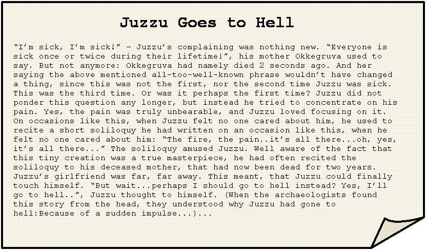 Juzzu Goes to Hell “I’m sick, I’m sick!” – Juzzu’s complaining was nothing new. “Everyone is sick once or twice during their lifetime!”, his mother Okkegruva used to say. But not anymore: Okkegruva had namely died 2 seconds ago. And her saying the above mentioned all-too-well-known phrase wouldn’t have changed a thing, since this was not the first, nor the second time Juzzu was sick. This was the third time. Or was it perhaps the first time? Juzzu did not ponder this question any longer, but instead he tried to concentrate on his pain. Yes, the pain was truly unbearable, and Juzzu loved focusing on it. On occasions like this, when Juzzu felt no one cared about him, he used to recite a short soliloquy he had written on an occasion like this, when he felt no one cared about him: “The fire, the pain..it’s all there...oh, yes, it’s all there...” The soliloquy amused Juzzu. Well aware of the fact that this tiny creation was a true masterpiece, he had often recited the soliloquy to his deceased mother, that had now been dead for two years. Juzzu’s girlfriend was far, far away. This meant, that Juzzu could finally touch himself. “But wait...perhaps I should go to hell instead? Yes, I’ll go to hell..”, Juzzu thought to himself. (When the archaeologists found this story from the head, they understood why Juzzu had gone to hell:Because of a sudden impulse...)... |