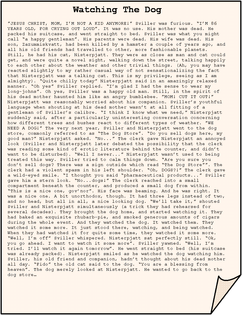 Watching The Dog ”JESUS CHRIST, MOM, I’M NOT A KID ANYMORE!” Sviller was furious. “I’M 86 YEARS OLD, FOR CRYING OUT LOUD”. It was no use. His mother was dead. He packed his suitcase, and went straight to bed. Sviller was what you might call “a happy gentleman”. His parents were dead. His wife was dead. His son, Zazummiskvatt, had been killed by a hamster a couple of years ago, and all his old friends had travelled to other, more fashionable planets. Still, he had his cat, Nisterpjatt. They were as close as man and cat could get, and were quite a novel sight, walking down the street, talking happily to each other about the weather and other trivial things. (Ah, you may have reacted slightly to my rather casual way of not sensationalizing the fact that Nisterpjatt was a talking cat. This is my privilege, seeing as I am almighty). “Quite chilly today” Nisterpjatt said in an amazingly relaxed manner. “Oh yes” Sviller replied. “I’m glad I had the sense to wear my long-johns”. Oh yes, Sviller was a happy old man. Still, in the spirit of his dead mother haunted him like an angry bumblebee. ”MOM! CUT IT OUT!” Nisterpjatt was reasonably worried about his companion. Sviller’s youthful language when shouting at his dead mother wasn’t at all fitting of a gentleman of Sviller’s calibre. “I think I know what we need,” Nisterpjatt suddenly said, after a particularly uninteresting conversation concerning how different trees and bushes react to different types of weather. ”WE NEED A DOG!” The very next year, Sviller and Nisterpjatt went to the dog store, commonly referred to as “The Dog Store”. “Do you sell dogs here, my good man?” Nisterpjatt asked. “No...” The clerk gave Nisterpjatt an annoyed look (Sviller and Nisterpjatt later debated the possibility that the clerk was reading some kind of erotic literature behind the counter, and didn’t want to be disturbed). “Well I never...” Nisterpjatt wasn’t used to being treated this way. Sviller tried to calm things down. “Are you sure you don’t sell dogs? There was a sign outside which read “The Dog Store””. The clerk had a violent spasm in his left shoulder. “Oh, DOGS?!” The clerk gave a wild-eyed smile. “I thought you said “pharmaceutical products...” Sviller gave him a stern look. “No...dogs!” The clerk reached into a small compartment beneath the counter, and produced a small dog from within. “This is a nice one, gov’nor”. His face was beaming. And he was right. It was a nice one. A bit unorthodox, though. It had three legs instead of two, and no head, but all in all, a nice looking dog. “We’ll take it,” shouted Sviller and Nisterpjatt simultaneously (a trick they had rehearsed for several decades). They brought the dog home, and started watching it. They had baked an exquisite rhubarb-pie, and smoked generous amounts of cigars during the whole event. And they watched the dog. It watched them. They watched it some more. It just stood there, watching, and being watched. When they had watched it for quite some time, they watched it some more. “Well, I’m off” Sviller whispered. Nisterpjatt sat perfectly still. “Ok, you go ahead. I want to watch it some more”. Sviller yawned. “Well, I’m tried. I’ll watch it again tomorrow”. He went straight to bed (his suitcase was already packed). Nisterpjatt smiled as he watched the dog watching him. Sviller, his old friend and companion, hadn’t thought about his dead mother all day. “Fido” the old cat said to the dog. “You are a blessing from heaven”. The dog merely looked at Nisterpjatt. He wanted to go back to the dog store… |
