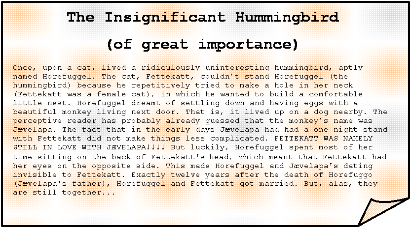 The Insignificant Hummingbird (of great importance) Once, upon a cat, lived a ridiculously uninteresting hummingbird, aptly named Horefuggel. The cat, Fettekatt, couldn’t stand Horefuggel (the hummingbird) because he repetitively tried to make a hole in her neck (Fettekatt was a female cat), in which he wanted to build a comfortable little nest. Horefuggel dreamt of settling down and having eggs with a beautiful monkey living next door. That is, it lived up on a dog nearby. The perceptive reader has probably already guessed that the monkey’s name was Jævelapa. The fact that in the early days Jævelapa had had a one night stand with Fettekatt did not make things less complicated. FETTEKATT WAS NAMELY STILL IN LOVE WITH JÆVELAPA!!!! But luckily, Horefuggel spent most of her time sitting on the back of Fettekatt's head, which meant that Fettekatt had her eyes on the opposite side. This made Horefuggel and Jævelapa's dating invisible to Fettekatt. Exactly twelve years after the death of Horefuggo (Jævelapa's father), Horefuggel and Fettekatt got married. But, alas, they are still together... |