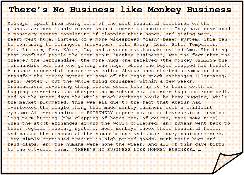 There’s No Business like Monkey Business Monkeys, apart from being some of the most beautiful creatures on the planet, are devilishly clever when it comes to business. They have developed a monetary system consisting of clapping their hands, and giving warm, heart-felt hugs, instead of a more widespread “cash”-based system. This can be confusing to strangers (non-apes), like Smirg, Lome, Saft, Tempurion, Høl, Littunæ, Pes, Kåker, Lu, and a young rattlesnake called Oms. The thing that confused people the most about “monkey business”, was the fact that the cheaper the merchandise, the more hugs one received (the monkey SELLING the merchandise was the one giving the hugs, while the buyer clapped his hands). A rather successful businessman called Abacus once started a campaign to transfer the monkey-system to some of the major stock-exchanges (Ulstovang, Bach, Septer), but the whole thing collapsed within a few weeks. Transactions involving cheap stocks could take up to 72 hours worth of hugging (remember, the cheaper the merchandise, the more hugs one received), and on the worst days the whole stock-exchange would be busy hugging, while the market plummeted. This was all due to the fact that Abacus had overlooked the single thing that made monkey business such a brilliant system: All merchandise is EXTREMELY expensive, so no transactions involve long-term hugging (the clapping of hands can, of course, take some time). When the stock-exchanges around the world collapsed, and humans went back to their regular monetary systems, most monkeys shook their beautiful heads, and patted their noses at the human beings and their lousy business-sense. They simply continued trading in high-priced goods, with their hugs and hand-claps, and the humans were none the wiser. And all of this gave birth to the oft-used term: “THERE’S NO BUSINESS LIKE MONKEY BUSINESS…”… |