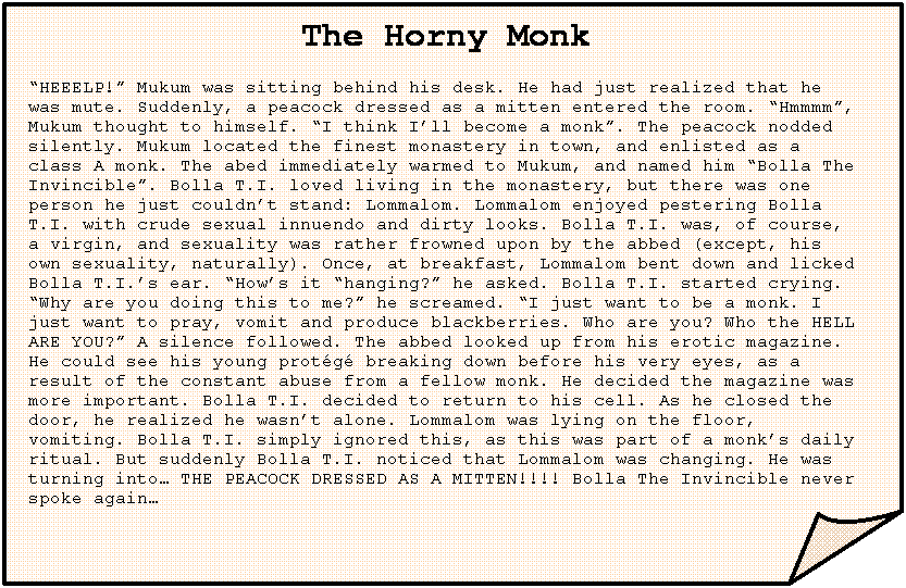 The Horny Monk “HEEELP!” Mukum was sitting behind his desk. He had just realized that he was mute. Suddenly, a peacock dressed as a mitten entered the room. “Hmmmm”, Mukum thought to himself. “I think I’ll become a monk”. The peacock nodded silently. Mukum located the finest monastery in town, and enlisted as a class A monk. The abed immediately warmed to Mukum, and named him “Bolla The Invincible”. Bolla T.I. loved living in the monastery, but there was one person he just couldn’t stand: Lommalom. Lommalom enjoyed pestering Bolla T.I. with crude sexual innuendo and dirty looks. Bolla T.I. was, of course, a virgin, and sexuality was rather frowned upon by the abbed (except, his own sexuality, naturally). Once, at breakfast, Lommalom bent down and licked Bolla T.I.’s ear. “How’s it “hanging?” he asked. Bolla T.I. started crying. “Why are you doing this to me?” he screamed. “I just want to be a monk. I just want to pray, vomit and produce blackberries. Who are you? Who the HELL ARE YOU?” A silence followed. The abbed looked up from his erotic magazine. He could see his young protégé breaking down before his very eyes, as a result of the constant abuse from a fellow monk. He decided the magazine was more important. Bolla T.I. decided to return to his cell. As he closed the door, he realized he wasn’t alone. Lommalom was lying on the floor, vomiting. Bolla T.I. simply ignored this, as this was part of a monk’s daily ritual. But suddenly Bolla T.I. noticed that Lommalom was changing. He was turning into… THE PEACOCK DRESSED AS A MITTEN!!!! Bolla The Invincible never spoke again… |