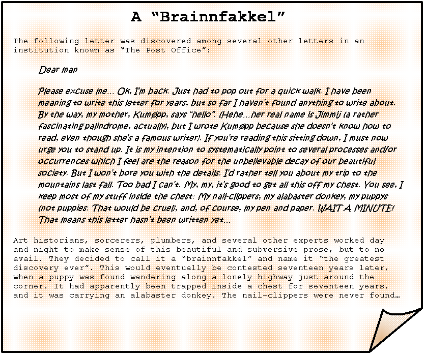 A “Brainnfakkel” The following letter was discovered among several other letters in an institution known as “The Post Office”: Dear man Please excuse me… Ok, I’m back. Just had to pop out for a quick walk. I have been meaning to write this letter for years, but so far I haven’t found anything to write about. By the way, my mother, Kumøpp, says “hello”. (Hehe…her real name is Jimmij (a rather fascinating palindrome, actually), but I wrote Kumøpp because she doesn’t know how to read, even though she’s a famous writer). If you’re reading this sitting down, I must now urge you to stand up. It is my intention to systematically point to several processes and/or occurrences which I feel are the reason for the unbelievable decay of our beautiful society. But I won’t bore you with the details. I’d rather tell you about my trip to the mountains last fall. Too bad I can’t. My, my, it’s good to get all this off my chest. You see, I keep most of my stuff inside the chest: My nail-clippers, my alabaster donkey, my puppys (not puppies. That would be cruel), and, of course, my pen and paper. WAIT A MINUTE! That means this letter hasn’t been written yet… Art historians, sorcerers, plumbers, and several other experts worked day and night to make sense of this beautiful and subversive prose, but to no avail. They decided to call it a “brainnfakkel” and name it “the greatest discovery ever”. This would eventually be contested seventeen years later, when a puppy was found wandering along a lonely highway just around the corner. It had apparently been trapped inside a chest for seventeen years, and it was carrying an alabaster donkey. The nail-clippers were never found… |