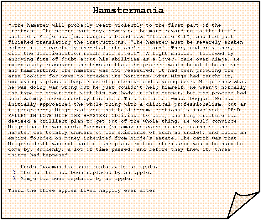 Hamstermania “…the hamster will probably react violently to the first part of the treatment. The second part may, however, be more rewarding to the little bastard”. Mimje had just bought a brand new “Pleasure Kit”, and had just finished translating the instructions. “The hamster must be severely shaken before it is carefully inserted into one’s “fjord”. Then, and only then, will the disorientation reach full effect”. A light shudder, followed by annoying fits of doubt about his abilities as a lover, came over Mimje. He immediately reassured the hamster that the process would benefit both man- and hamsterkind. The hamster was NOT reassured. It had been prowling the area looking for ways to broaden its horizons, when Mimje had caught it, employing a plastic bag, 3 oz of plutonium and a young bear. Mimje knew what he was doing was wrong but he just couldn’t help himself. He wasn’t normally the type to experiment with his own body in this manner, but the process had been warmly recommended by his uncle Tucaman, a self-made beggar. He had initially approached the whole thing with a clinical professionalism, but as it progressed, Mimje realized that he’d become emotionally involved – HE’D FALLEN IN LOVE WITH THE HAMSTER! Oblivious to this, the tiny creature had devised a brilliant plan to get out of the whole thing. He would convince Mimje that he was uncle Tucaman (an amazing coincidence, seeing as the hamster was totally unaware of the existence of such an uncle), and build an empire founded on money inherited from Mimje’s estate. The catch was that Mimje’s death was not part of the plan, so the inheritance would be hard to come by. Suddenly, a lot of time passed, and before they knew it, three things had happened: