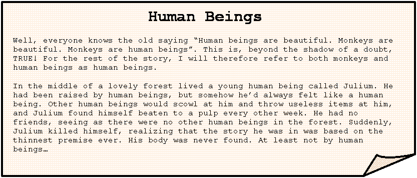 Human Beings Well, everyone knows the old saying “Human beings are beautiful. Monkeys are beautiful. Monkeys are human beings”. This is, beyond the shadow of a doubt, TRUE! For the rest of the story, I will therefore refer to both monkeys and human beings as human beings. In the middle of a lovely forest lived a young human being called Julium. He had been raised by human beings, but somehow he’d always felt like a human being. Other human beings would scowl at him and throw useless items at him, and Julium found himself beaten to a pulp every other week. He had no friends, seeing as there were no other human beings in the forest. Suddenly, Julium killed himself, realizing that the story he was in was based on the thinnest premise ever. His body was never found. At least not by human beings… |