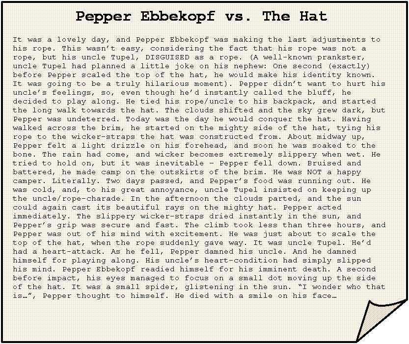 Pepper Ebbekopf vs. The Hat It was a lovely day, and Pepper Ebbekopf was making the last adjustments to his rope. This wasn’t easy, considering the fact that his rope was not a rope, but his uncle Tupel, DISGUISED as a rope. (A well-known prankster, uncle Tupel had planned a little joke on his nephew: One second (exactly) before Pepper scaled the top of the hat, he would make his identity known. It was going to be a truly hilarious moment). Pepper didn’t want to hurt his uncle’s feelings, so, even though he’d instantly called the bluff, he decided to play along. He tied his rope/uncle to his backpack, and started the long walk towards the hat. The clouds shifted and the sky grew dark, but Pepper was undeterred. Today was the day he would conquer the hat. Having walked across the brim, he started on the mighty side of the hat, tying his rope to the wicker-straps the hat was constructed from. About midway up, Pepper felt a light drizzle on his forehead, and soon he was soaked to the bone. The rain had come, and wicker becomes extremely slippery when wet. He tried to hold on, but it was inevitable – Pepper fell down. Bruised and battered, he made camp on the outskirts of the brim. He was NOT a happy camper. Literally. Two days passed, and Pepper’s food was running out. He was cold, and, to his great annoyance, uncle Tupel insisted on keeping up the uncle/rope-charade. In the afternoon the clouds parted, and the sun could again cast its beautiful rays on the mighty hat. Pepper acted immediately. The slippery wicker-straps dried instantly in the sun, and Pepper’s grip was secure and fast. The climb took less than three hours, and Pepper was out of his mind with excitement. He was just about to scale the top of the hat, when the rope suddenly gave way. It was uncle Tupel. He’d had a heart-attack. As he fell, Pepper damned his uncle. And he damned himself for playing along. His uncle’s heart-condition had simply slipped his mind. Pepper Ebbekopf readied himself for his imminent death. A second before impact, his eyes managed to focus on a small dot moving up the side of the hat. It was a small spider, glistening in the sun. “I wonder who that is…”, Pepper thought to himself. He died with a smile on his face… |