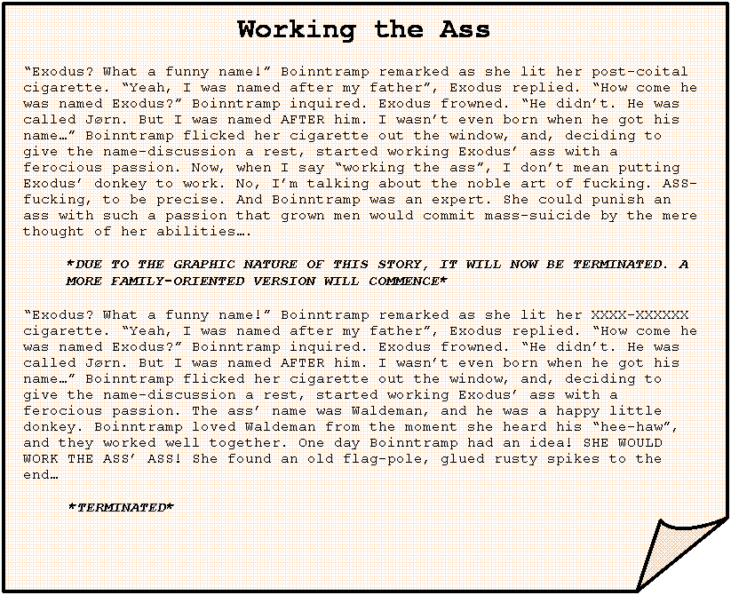Working the Ass “Exodus? What a funny name!” Boinntramp remarked as she lit her post-coital cigarette. “Yeah, I was named after my father”, Exodus replied. “How come he was named Exodus?” Boinntramp inquired. Exodus frowned. “He didn’t. He was called Jřrn. But I was named AFTER him. I wasn’t even born when he got his name…” Boinntramp flicked her cigarette out the window, and, deciding to give the name-discussion a rest, started working Exodus’ ass with a ferocious passion. Now, when I say “working the ass”, I don’t mean putting Exodus’ donkey to work. No, I’m talking about the noble art of fucking. ASS-fucking, to be precise. And Boinntramp was an expert. She could punish an ass with such a passion that grown men would commit mass-suicide by the mere thought of her abilities…. *DUE TO THE GRAPHIC NATURE OF THIS STORY, IT WILL NOW BE TERMINATED. A MORE FAMILY-ORIENTED VERSION WILL COMMENCE* “Exodus? What a funny name!” Boinntramp remarked as she lit her XXXX-XXXXXX cigarette. “Yeah, I was named after my father”, Exodus replied. “How come he was named Exodus?” Boinntramp inquired. Exodus frowned. “He didn’t. He was called Jřrn. But I was named AFTER him. I wasn’t even born when he got his name…” Boinntramp flicked her cigarette out the window, and, deciding to give the name-discussion a rest, started working Exodus’ ass with a ferocious passion. The ass’ name was Waldeman, and he was a happy little donkey. Boinntramp loved Waldeman from the moment she heard his “hee-haw”, and they worked well together. One day Boinntramp had an idea! SHE WOULD WORK THE ASS’ ASS! She found an old flag-pole, glued rusty spikes to the end… *TERMINATED* |