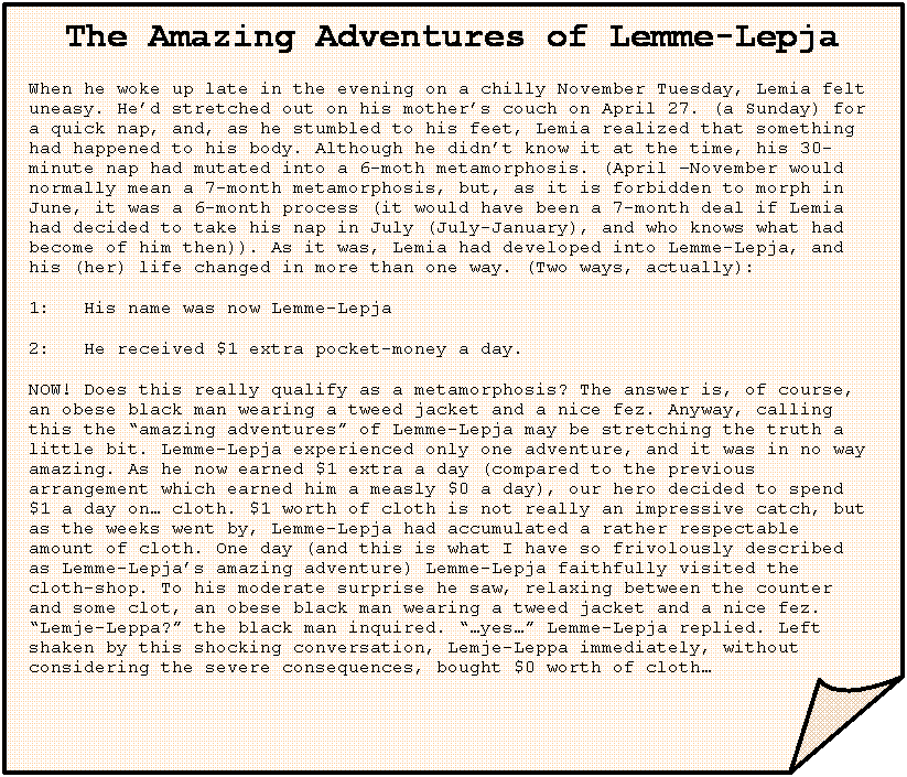 The Amazing Adventures of Lemme-Lepja When he woke up late in the evening on a chilly November Tuesday, Lemia felt uneasy. He’d stretched out on his mother’s couch on April 27. (a Sunday) for a quick nap, and, as he stumbled to his feet, Lemia realized that something had happened to his body. Although he didn’t know it at the time, his 30-minute nap had mutated into a 6-moth metamorphosis. (April –November would normally mean a 7-month metamorphosis, but, as it is forbidden to morph in June, it was a 6-month process (it would have been a 7-month deal if Lemia had decided to take his nap in July (July-January), and who knows what had become of him then)). As it was, Lemia had developed into Lemme-Lepja, and his (her) life changed in more than one way. (Two ways, actually): 1: His name was now Lemme-Lepja 2: He received $1 extra pocket-money a day. NOW! Does this really qualify as a metamorphosis? The answer is, of course, an obese black man wearing a tweed jacket and a nice fez. Anyway, calling this the “amazing adventures” of Lemme-Lepja may be stretching the truth a little bit. Lemme-Lepja experienced only one adventure, and it was in no way amazing. As he now earned $1 extra a day (compared to the previous arrangement which earned him a measly $0 a day), our hero decided to spend $1 a day on… cloth. $1 worth of cloth is not really an impressive catch, but as the weeks went by, Lemme-Lepja had accumulated a rather respectable amount of cloth. One day (and this is what I have so frivolously described as Lemme-Lepja’s amazing adventure) Lemme-Lepja faithfully visited the cloth-shop. To his moderate surprise he saw, relaxing between the counter and some clot, an obese black man wearing a tweed jacket and a nice fez. “Lemje-Leppa?” the black man inquired. “…yes…” Lemme-Lepja replied. Left shaken by this shocking conversation, Lemje-Leppa immediately, without considering the severe consequences, bought $0 worth of cloth… |