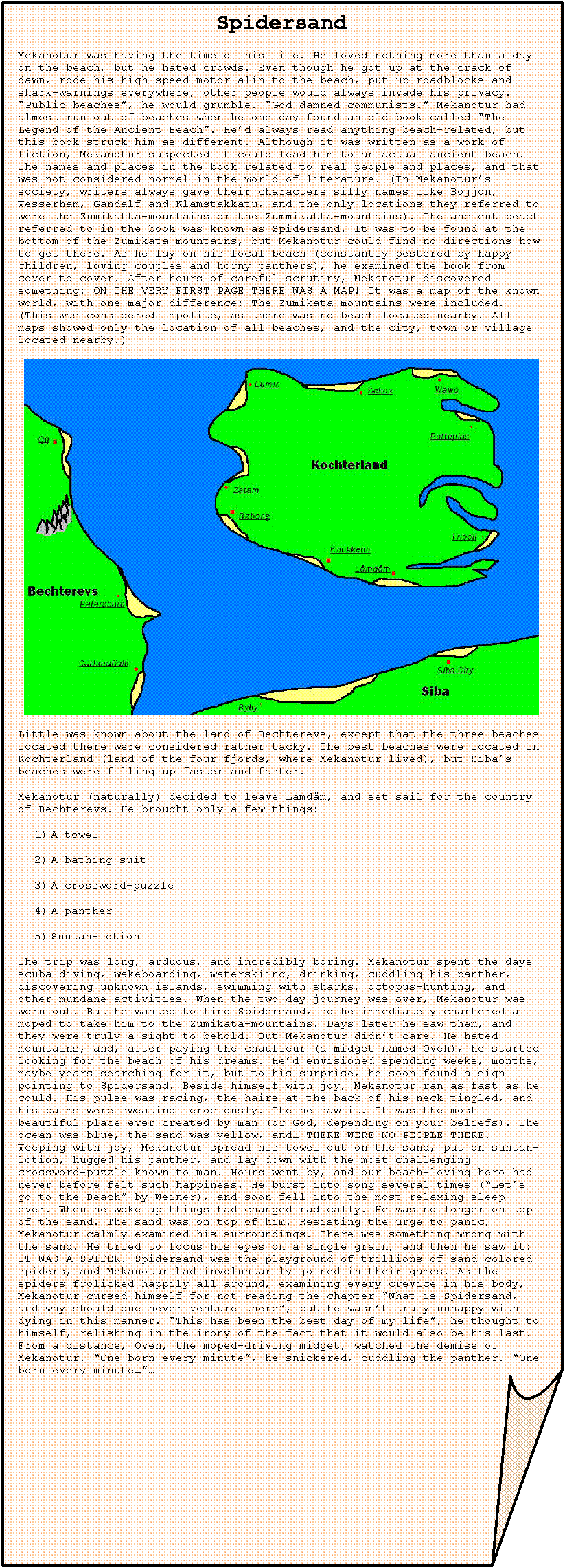Spidersand Mekanotur was having the time of his life. He loved nothing more than a day on the beach, but he hated crowds. Even though he got up at the crack of dawn, rode his high-speed motor-alin to the beach, put up roadblocks and shark-warnings everywhere, other people would always invade his privacy. “Public beaches”, he would grumble. “God-damned communists!” Mekanotur had almost run out of beaches when he one day found an old book called “The Legend of the Ancient Beach”. He’d always read anything beach-related, but this book struck him as different. Although it was written as a work of fiction, Mekanotur suspected it could lead him to an actual ancient beach. The names and places in the book related to real people and places, and that was not considered normal in the world of literature. (In Mekanotur’s society, writers always gave their characters silly names like Bojjon, Wesserham, Gandalf and Klamstakkatu, and the only locations they referred to were the Zumikatta-mountains or the Zummikatta-mountains). The ancient beach referred to in the book was known as Spidersand. It was to be found at the bottom of the Zumikata-mountains, but Mekanotur could find no directions how to get there. As he lay on his local beach (constantly pestered by happy children, loving couples and horny panthers), he examined the book from cover to cover. After hours of careful scrutiny, Mekanotur discovered something: ON THE VERY FIRST PAGE THERE WAS A MAP! It was a map of the known world, with one major difference: The Zumikata-mountains were included. (This was considered impolite, as there was no beach located nearby. All maps showed only the location of all beaches, and the city, town or village located nearby.)