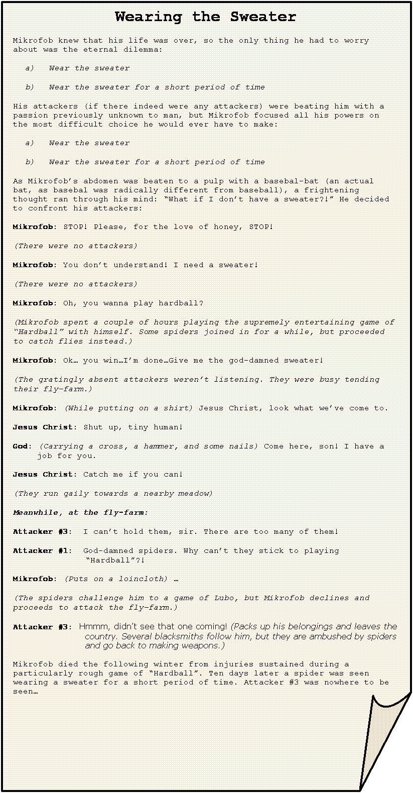 Wearing the Sweater Mikrofob knew that his life was over, so the only thing he had to worry about was the eternal dilemma: a) Wear the sweater b) Wear the sweater for a short period of time His attackers (if there indeed were any attackers) were beating him with a passion previously unknown to man, but Mikrofob focused all his powers on the most difficult choice he would ever have to make: a) Wear the sweater b) Wear the sweater for a short period of time As Mikrofob’s abdomen was beaten to a pulp with a basebal-bat (an actual bat, as basebal was radically different from baseball), a frightening thought ran through his mind: “What if I don’t have a sweater?!” He decided to confront his attackers: Mikrofob: STOP! Please, for the love of honey, STOP! (There were no attackers) Mikrofob: You don’t understand! I need a sweater! (There were no attackers) Mikrofob: Oh, you wanna play hardball? (Mikrofob spent a couple of hours playing the supremely entertaining game of “Hardball” with himself. Some spiders joined in for a while, but proceeded to catch flies instead.) Mikrofob: Ok… you win…I’m done…Give me the god-damned sweater! (The gratingly absent attackers weren’t listening. They were busy tending their fly-farm.) Mikrofob: (While putting on a shirt) Jesus Christ, look what we’ve come to. Jesus Christ: Shut up, tiny human! God: (Carrying a cross, a hammer, and some nails) Come here, son! I have a job for you. Jesus Christ: Catch me if you can! (They run gaily towards a nearby meadow) Meanwhile, at the fly-farm: Attacker #3: I can’t hold them, sir. There are too many of them! Attacker #1: God-damned spiders. Why can’t they stick to playing “Hardball”?! Mikrofob: (Puts on a loincloth) … (The spiders challenge him to a game of Lubo, but Mikrofob declines and proceeds to attack the fly-farm.) Attacker #3: Hmmm, didn’t see that one coming! (Packs up his belongings and leaves the country. Several blacksmiths follow him, but they are ambushed by spiders and go back to making weapons.) Mikrofob died the following winter from injuries sustained during a particularly rough game of “Hardball”. Ten days later a spider was seen wearing a sweater for a short period of time. Attacker #3 was nowhere to be seen… |