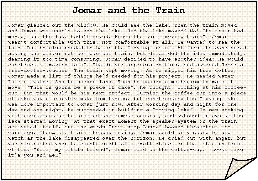 Jomar and the Train Jomar glanced out the window. He could see the lake. Then the train moved, and Jomar was unable to see the lake. Had the lake moved? No! The train had moved, but the lake hadn’t moved. Hence the term “moving train”. Jomar wasn’t comfortable with this. Not comfortable at all. He wanted to see the lake. But he also needed to be on the “moving train”. At first he considered asking the driver not to move the train, but discarded the idea immediately, deeming it too time-consuming. Jomar decided to have another idea: He would construct a “moving lake”. The driver appreciated this, and awarded Jomar a free-coffee-voucher. The train kept moving. As he sipped his free coffee, Jomar made a list of things he’d needed for his project. He needed water. Lots of water. And he needed land. Then he needed a mechanism to make it move. “This is gonna be a piece of cake”, he thought, looking at his coffee-cup. But that would be his next project. Turning the coffee-cup into a piece of cake would probably make him famous, but constructing the “moving lake” was more important to Jomar just now. After working day and night for one day and one night, he succeeded in building a “moving lake”. He was shaking with excitement as he pressed the remote control, and watched in awe as the lake started moving. At that exact moment the speaker-system on the train activated itself, and the words “next stop Lusby” boomed throughout the carriage. Then… the train stopped moving. Jomar could only stand by and watch as the lake disappeared over the horizon. He cried out with anger, but was distracted when he caught sight of a small object on the table in front of him. “Well, my little friend”, Jomar said to the coffee-cup. “Looks like it’s you and me…”… |