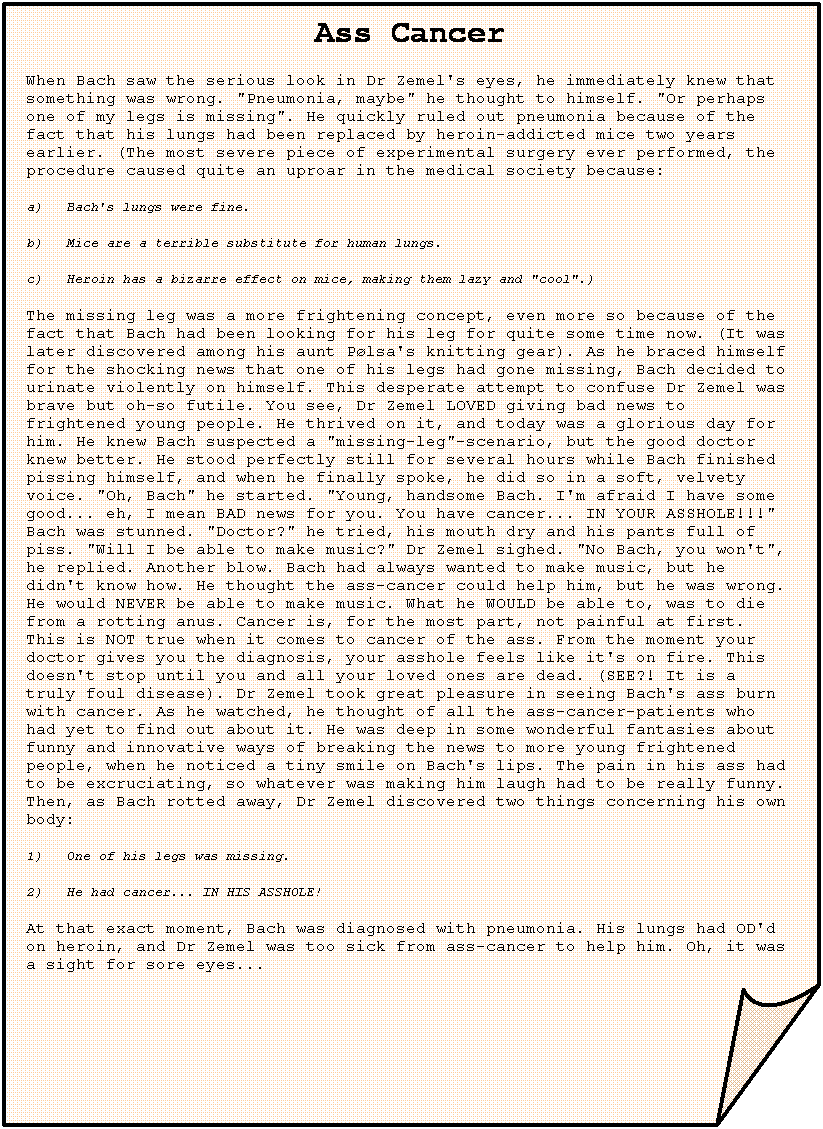 Ass Cancer When Bach saw the serious look in Dr Zemel's eyes, he immediately knew that something was wrong. "Pneumonia, maybe" he thought to himself. "Or perhaps one of my legs is missing". He quickly ruled out pneumonia because of the fact that his lungs had been replaced by heroin-addicted mice two years earlier. (The most severe piece of experimental surgery ever performed, the procedure caused quite an uproar in the medical society because: a) Bach's lungs were fine. b) Mice are a terrible substitute for human lungs. c) Heroin has a bizarre effect on mice, making them lazy and "cool".) The missing leg was a more frightening concept, even more so because of the fact that Bach had been looking for his leg for quite some time now. (It was later discovered among his aunt Pølsa's knitting gear). As he braced himself for the shocking news that one of his legs had gone missing, Bach decided to urinate violently on himself. This desperate attempt to confuse Dr Zemel was brave but oh-so futile. You see, Dr Zemel LOVED giving bad news to frightened young people. He thrived on it, and today was a glorious day for him. He knew Bach suspected a "missing-leg"-scenario, but the good doctor knew better. He stood perfectly still for several hours while Bach finished pissing himself, and when he finally spoke, he did so in a soft, velvety voice. "Oh, Bach" he started. "Young, handsome Bach. I'm afraid I have some good... eh, I mean BAD news for you. You have cancer... IN YOUR ASSHOLE!!!" Bach was stunned. "Doctor?" he tried, his mouth dry and his pants full of piss. "Will I be able to make music?" Dr Zemel sighed. "No Bach, you won't", he replied. Another blow. Bach had always wanted to make music, but he didn't know how. He thought the ass-cancer could help him, but he was wrong. He would NEVER be able to make music. What he WOULD be able to, was to die from a rotting anus. Cancer is, for the most part, not painful at first. This is NOT true when it comes to cancer of the ass. From the moment your doctor gives you the diagnosis, your asshole feels like it's on fire. This doesn't stop until you and all your loved ones are dead. (SEE?! It is a truly foul disease). Dr Zemel took great pleasure in seeing Bach's ass burn with cancer. As he watched, he thought of all the ass-cancer-patients who had yet to find out about it. He was deep in some wonderful fantasies about funny and innovative ways of breaking the news to more young frightened people, when he noticed a tiny smile on Bach's lips. The pain in his ass had to be excruciating, so whatever was making him laugh had to be really funny. Then, as Bach rotted away, Dr Zemel discovered two things concerning his own body: 1) One of his legs was missing. 2) He had cancer... IN HIS ASSHOLE! At that exact moment, Bach was diagnosed with pneumonia. His lungs had OD'd on heroin, and Dr Zemel was too sick from ass-cancer to help him. Oh, it was a sight for sore eyes... |