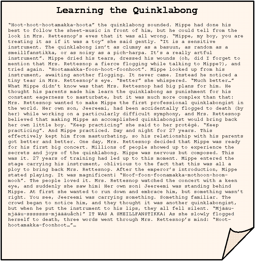 Learning the Quinklabong “Hoot-hoot-hootamakka-hoota” the quinklabong sounded. Mippe had done his best to follow the sheet-music in front of him, but he could tell from the look in Mrs. Rettesnop’s eves that it was all wrong. “Mippe, my boy, you are treating it as if it was a toy” she said gently. “It is a sensitive instrument. The quinklabong isn’t as clumsy as a basuun, as random as a smeillfanstikka, or as noisy as a pich-harpa. It’s a really artful instrument”. Mippe dried his tears, dressed his wounds (oh, did I forget to mention that Mrs. Rettesnop a fierce flogging while talking to Mippe?), and tried again. “Hootamakka-foon-hoot-foonhoot”. Mippe looked up from his instrument, awaiting another flogging. It never came. Instead he noticed a tiny tear in Mrs. Rettesnop’s eye. “Better” she whispered. “Much better…” What Mippe didn’t know was that Mrs. Rettesnop had big plans for him. He thought his parents made him learn the quinklabong as punishment for his constant eagerness to masturbate, but it was much more complex than that: Mrs. Rettesnop wanted to make Mippe the first professional quinklabongist in the world. Her own son, Jeereemi, had been accidentally flogged to death (by her) while working on a particularly difficult symphony, and Mrs. Rettesnop believed that making Mippe an accomplished quinklabongist would bring back her own little boy. “Keep practicing” she said to her protégé. “Keep practicing”. And Mippe practiced. Day and night for 27 years. This effectively kept him from masturbating, so his relationship with his parents got better and better. One day, Mrs. Rettesnop decided that Mippe was ready for his first big concert. Millions of people showed up to experience the secrets and joys of the quinklabong. Mippe was nervous but composed. This was it. 27 years of training had led up to this moment. Mippe entered the stage carrying his instrument, oblivious to the fact that this was all a ploy to bring back Mrs. Rettesnop. After the emperor’s introduction, Mippe stated playing. It was magnificent! “Hoof-foon-foonamakka-mothoon-hoom-mooh”. The people loved it. Mrs. Rettesnop watched the concert with a keen eye, and suddenly she saw him! Her own son! Jeereemi was standing behind Mippe. At first she wanted to run down and embrace him, but something wasn’t right. You see, Jeereemi was carrying something. Something familiar. The crowd began to notice him, and they thought it was another quinklabongist, but when he put the instrument to his lips, they all fell silent. “Mjääu-mjääu-sssssss-mjäääuåch!” IT WAS A SMEILLFANSTIKKA! As she slowly flogged herself to death, three words went through Mrs. Rettesnop’s mind: “Hoot-hootamakka-foonhoot…”… |