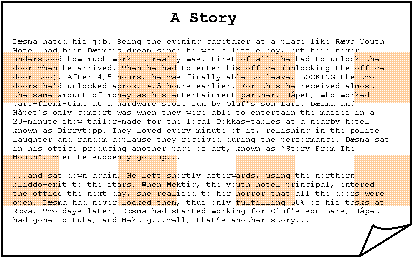 A Story Dæsma hated his job. Being the evening caretaker at a place like Ræva Youth Hotel had been Dæsma’s dream since he was a little boy, but he’d never understood how much work it really was. First of all, he had to unlock the door when he arrived. Then he had to enter his office (unlocking the office door too). After 4,5 hours, he was finally able to leave, LOCKING the two doors he’d unlocked aprox. 4,5 hours earlier. For this he received almost the same amount of money as his entertainment-partner, Håpet, who worked part-flexi-time at a hardware store run by Oluf’s son Lars. Dæsma and Håpet’s only comfort was when they were able to entertain the masses in a 20-minute show tailor-made for the local Pokkas-tables at a nearby hotel known as Dirrytopp. They loved every minute of it, relishing in the polite laughter and random applause they received during the performance. Dæsma sat in his office producing another page of art, known as ”Story From The Mouth”, when he suddenly got up... ...and sat down again. He left shortly afterwards, using the northern bliddo-exit to the stars. When Mektig, the youth hotel principal, entered the office the next day, she realised to her horror that all the doors were open. Dæsma had never locked them, thus only fulfilling 50% of his tasks at Ræva. Two days later, Dæsma had started working for Oluf’s son Lars, Håpet had gone to Ruha, and Mektig...well, that’s another story... |