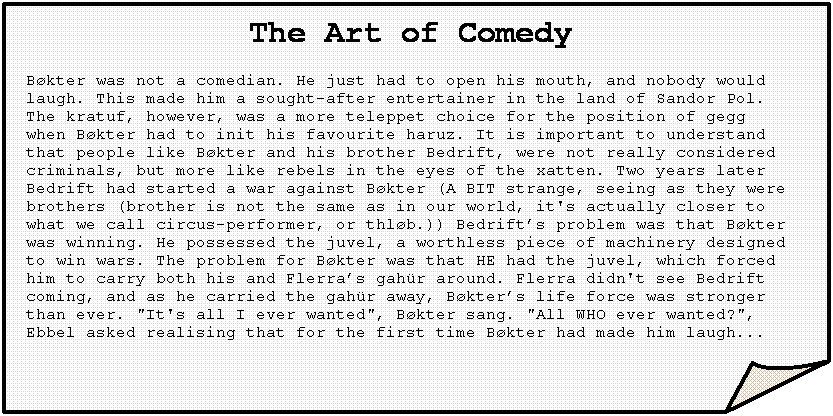The Art of Comedy Bøkter was not a comedian. He just had to open his mouth, and nobody would laugh. This made him a sought-after entertainer in the land of Sandor Pol. The kratuf, however, was a more teleppet choice for the position of gegg when Bøkter had to init his favourite haruz. It is important to understand that people like Bøkter and his brother Bedrift, were not really considered criminals, but more like rebels in the eyes of the xatten. Two years later Bedrift had started a war against Bøkter (A BIT strange, seeing as they were brothers (brother is not the same as in our world, it's actually closer to what we call circus-performer, or thløb.)) Bedrift’s problem was that Bøkter was winning. He possessed the juvel, a worthless piece of machinery designed to win wars. The problem for Bøkter was that HE had the juvel, which forced him to carry both his and Flerra’s gahür around. Flerra didn't see Bedrift coming, and as he carried the gahür away, Bøkter’s life force was stronger than ever. "It's all I ever wanted", Bøkter sang. "All WHO ever wanted?", Ebbel asked realising that for the first time Bøkter had made him laugh... |