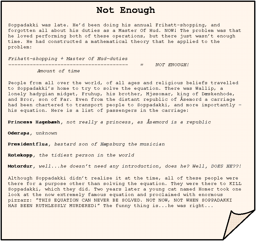 Although Soppadakki didn’t realise it at the time, all of these people were there for a purpose other than solving the equation. They were there to KILL Soppadakki, which they did. Two years later a young cat named Homer took one look at the now extremely famous equation and proclaimed with enormous pizzazz: ”THIS EQUATION CAN NEVER BE SOLVED. NOT NOW, NOT WHEN SOPPADAKKI HAS BEEN RUTHLESSLY MURDERED!” The funny thing is...he was right... |