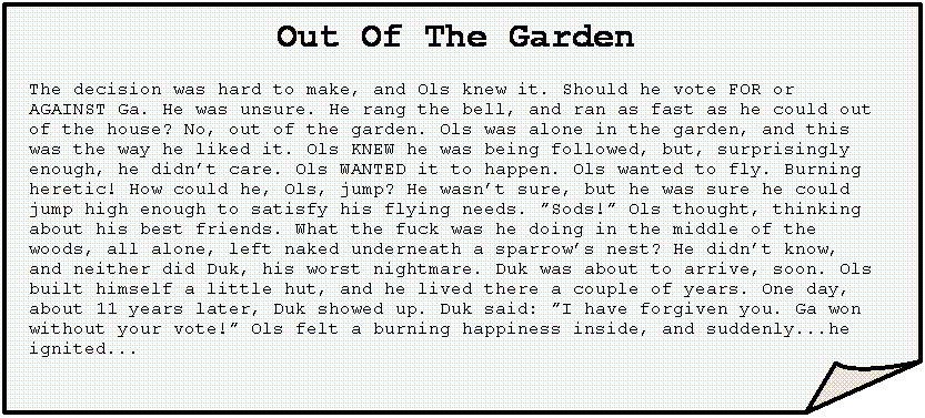 Out Of The Garden The decision was hard to make, and Ols knew it. Should he vote FOR or AGAINST Ga. He was unsure. He rang the bell, and ran as fast as he could out of the house? No, out of the garden. Ols was alone in the garden, and this was the way he liked it. Ols KNEW he was being followed, but, surprisingly enough, he didn’t care. Ols WANTED it to happen. Ols wanted to fly. Burning heretic! How could he, Ols, jump? He wasn’t sure, but he was sure he could jump high enough to satisfy his flying needs. ”Sods!” Ols thought, thinking about his best friends. What the fuck was he doing in the middle of the woods, all alone, left naked underneath a sparrow’s nest? He didn’t know, and neither did Duk, his worst nightmare. Duk was about to arrive, soon. Ols built himself a little hut, and he lived there a couple of years. One day, about 11 years later, Duk showed up. Duk said: ”I have forgiven you. Ga won without your vote!” Ols felt a burning happiness inside, and suddenly...he ignited... |