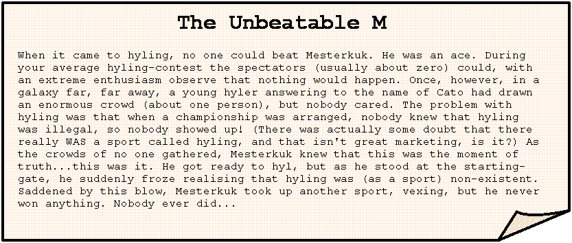 The Unbeatable M When it came to hyling, no one could beat Mesterkuk. He was an ace. During your average hyling-contest the spectators (usually about zero) could, with an extreme enthusiasm observe that nothing would happen. Once, however, in a galaxy far, far away, a young hyler answering to the name of Cato had drawn an enormous crowd (about one person), but nobody cared. The problem with hyling was that when a championship was arranged, nobody knew that hyling was illegal, so nobody showed up! (There was actually some doubt that there really WAS a sport called hyling, and that isn't great marketing, is it?) As the crowds of no one gathered, Mesterkuk knew that this was the moment of truth...this was it. He got ready to hyl, but as he stood at the starting-gate, he suddenly froze realising that hyling was (as a sport) non-existent. Saddened by this blow, Mesterkuk took up another sport, vexing, but he never won anything. Nobody ever did... |