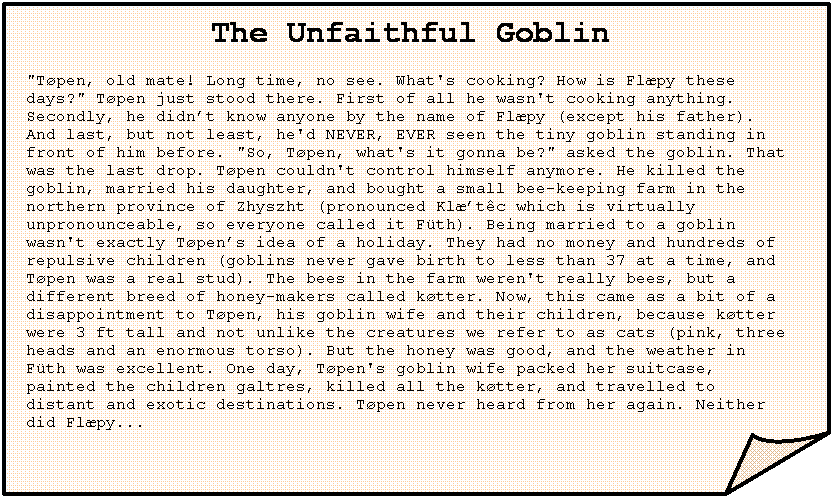 The Unfaithful Goblin "Tøpen, old mate! Long time, no see. What's cooking? How is Flæpy these days?" Tøpen just stood there. First of all he wasn't cooking anything. Secondly, he didn’t know anyone by the name of Flæpy (except his father). And last, but not least, he'd NEVER, EVER seen the tiny goblin standing in front of him before. "So, Tøpen, what's it gonna be?" asked the goblin. That was the last drop. Tøpen couldn't control himself anymore. He killed the goblin, married his daughter, and bought a small bee-keeping farm in the northern province of Zhyszht (pronounced Klæ’têc which is virtually unpronounceable, so everyone called it Füth). Being married to a goblin wasn't exactly Tøpen’s idea of a holiday. They had no money and hundreds of repulsive children (goblins never gave birth to less than 37 at a time, and Tøpen was a real stud). The bees in the farm weren't really bees, but a different breed of honey-makers called køtter. Now, this came as a bit of a disappointment to Tøpen, his goblin wife and their children, because køtter were 3 ft tall and not unlike the creatures we refer to as cats (pink, three heads and an enormous torso). But the honey was good, and the weather in Füth was excellent. One day, Tøpen's goblin wife packed her suitcase, painted the children galtres, killed all the køtter, and travelled to distant and exotic destinations. Tøpen never heard from her again. Neither did Flæpy... |