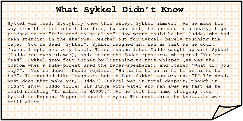 What Sykkel Didn’t Know Sykkel was dead. Everybody knew this except Sykkel himself. As he made his way from this lif (short for life) to the next, he shouted in a scary, high pitched voice "It's good to be alive". How wrong could he be? Duddo, who had been standing in the shadows, reached out for Sykkel, barely touching his cape. "You're dead, Sykkel". Sykkel laughed and ran as fast as he could (about 1 mph, not very fast). Three months later Duddo caught up with Sykkel (Duddo ran even slower), and, using the fadas-speakers, whispered "You're dead". Sykkel grew four inches by listening to this whisper (as was the custom when a sule-priest used the fadas-speakers), and roared "What did you say?". "You're dead", Duddo replied. "Ha ha ha ha ha hi hi hi hi hi ho ho ho?". It sounded like laughter, but in fact Sykkel was crying. "If I'm dead, what does that make you, Duddo?". Sykkel was in total despair, though it didn't show. Duddo filled his lungs with water and ran away as fast as he could shouting "It makes me HAPPY!". As he felt his name changing from Sykkel to Heppen, Heppen closed his eyes. The next thing he knew...he was still alive... |