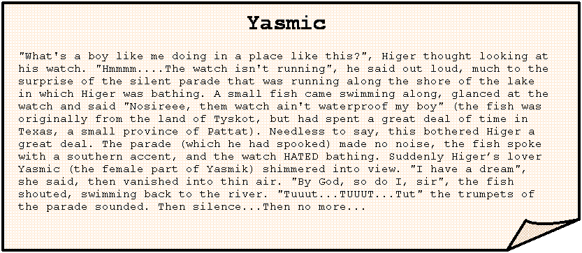 Yasmic "What's a boy like me doing in a place like this?", Higer thought looking at his watch. "Hmmmm....The watch isn't running", he said out loud, much to the surprise of the silent parade that was running along the shore of the lake in which Higer was bathing. A small fish came swimming along, glanced at the watch and said "Nosireee, them watch ain't waterproof my boy" (the fish was originally from the land of Tyskot, but had spent a great deal of time in Texas, a small province of Pattat). Needless to say, this bothered Higer a great deal. The parade (which he had spooked) made no noise, the fish spoke with a southern accent, and the watch HATED bathing. Suddenly Higer’s lover Yasmic (the female part of Yasmik) shimmered into view. "I have a dream", she said, then vanished into thin air. "By God, so do I, sir", the fish shouted, swimming back to the river. "Tuuut...TUUUT...Tut" the trumpets of the parade sounded. Then silence...Then no more... |