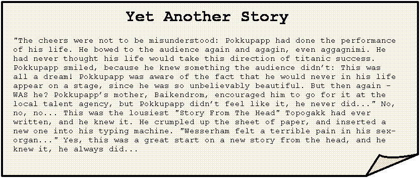 Yet Another Story "The cheers were not to be misunderstood: Pokkupapp had done the performance of his life. He bowed to the audience again and agagin, even aggagnimi. He had never thought his life would take this direction of titanic success. Pokkupapp smiled, because he knew something the audience didn’t: This was all a dream! Pokkupapp was aware of the fact that he would never in his life appear on a stage, since he was so unbelievably beautiful. But then again - WAS he? Pokkupapp’s mother, Baikendrom, encouraged him to go for it at the local talent agency, but Pokkupapp didn’t feel like it, he never did..." No, no, no... This was the lousiest "Story From The Head" Topogakk had ever written, and he knew it. He crumpled up the sheet of paper, and inserted a new one into his typing machine. "Wesserham felt a terrible pain in his sex-organ..." Yes, this was a great start on a new story from the head, and he knew it, he always did... |