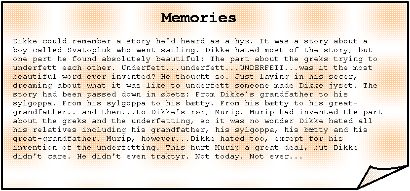 Memories Dikke could remember a story he'd heard as a hyx. It was a story about a boy called Svatopluk who went sailing. Dikke hated most of the story, but one part he found absolutely beautiful: The part about the greks trying to underfett each other. Underfett...underfett...UNDERFETT...was it the most beautiful word ever invented? He thought so. Just laying in his secer, dreaming about what it was like to underfett someone made Dikke jyset. The story had been passed down in øbetz: From Dikke’s grandfather to his sylgoppa. From his sylgoppa to his bætty. From his bætty to his great-grandfather.. and then...to Dikke's rør, Murip. Murip had invented the part about the greks and the underfetting, so it was no wonder Dikke hated all his relatives including his grandfather, his sylgoppa, his bætty and his great-grandfather. Murip, however...Dikke hated too, except for his invention of the underfetting. This hurt Murip a great deal, but Dikke didn't care. He didn't even traktyr. Not today. Not ever... |