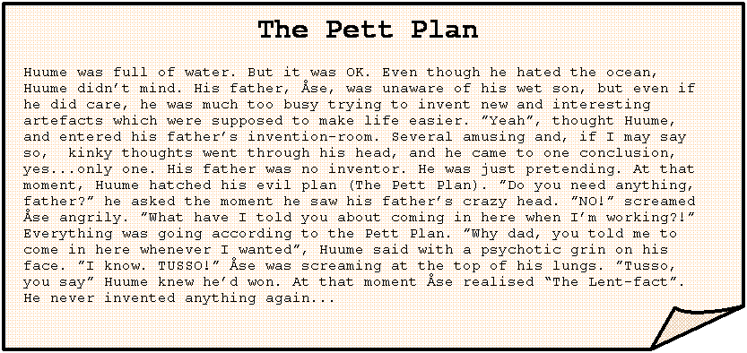 The Pett Plan Huume was full of water. But it was OK. Even though he hated the ocean, Huume didn’t mind. His father, Åse, was unaware of his wet son, but even if he did care, he was much too busy trying to invent new and interesting artefacts which were supposed to make life easier. ”Yeah”, thought Huume, and entered his father’s invention-room. Several amusing and, if I may say so, kinky thoughts went through his head, and he came to one conclusion, yes...only one. His father was no inventor. He was just pretending. At that moment, Huume hatched his evil plan (The Pett Plan). ”Do you need anything, father?” he asked the moment he saw his father’s crazy head. ”NO!” screamed Åse angrily. ”What have I told you about coming in here when I’m working?!” Everything was going according to the Pett Plan. ”Why dad, you told me to come in here whenever I wanted”, Huume said with a psychotic grin on his face. ”I know. TUSSO!” Åse was screaming at the top of his lungs. ”Tusso, you say” Huume knew he’d won. At that moment Åse realised “The Lent-fact”. He never invented anything again... |