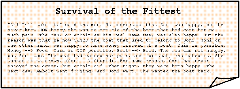 Survival of the Fittest ”Ok! I’ll take it!” said the man. He understood that Soni was happy, but he never knew HOW happy she was to get rid of the boat that had cost her so much pain. The man, or Ambolt as his real name was, was also happy. But the reason was that he now OWNED the boat that used to belong to Soni. Soni on the other hand, was happy to have money instead of a boat. This is possible: Money --> Food. This is NOT possible: Boat --> Food. The man was not hungry, but Soni was. The boat had caused her pain, and for that, she hated it. She wanted it to drown. (Soni --> Stupid). For some reason, Soni had never enjoyed the ocean, but Ambolt did. That night, they were both happy. The next day, Ambolt went jogging, and Soni wept. She wanted the boat back... |