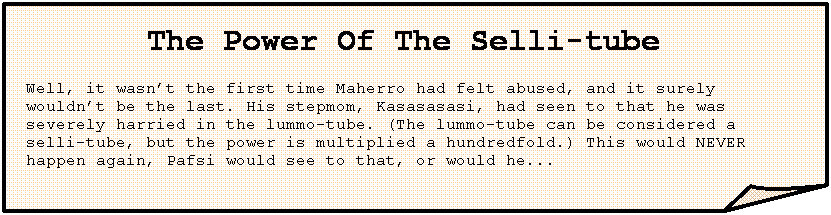 The Power Of The Selli-tube Well, it wasn’t the first time Maherro had felt abused, and it surely wouldn’t be the last. His stepmom, Kasasasasi, had seen to that he was severely harried in the lummo-tube. (The lummo-tube can be considered a selli-tube, but the power is multiplied a hundredfold.) This would NEVER happen again, Pafsi would see to that, or would he...