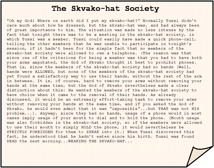 The Skvako-hat Society ”Oh my God! Where on earth did I put my skvako-hat?" Normally Tussi didn’t care much about how he dressed, but the skvako-hat was, and had always been of great importance to him. The situation was made no less intense by the fact that tonight there was to be a meeting in the skvako-hat society, in which Tussi was a member. Tussi could easily have made a quick phone-call, telling the other members that he was unable to participate in tonight’s session, if it hadn’t been for the simple fact that no members of the skvako-hat society were allowed to own a telephone. (The reason was that since one of the criterions for being a member was that you had to have both your arms amputated, the God of Skvako thought it best to prohibit phones. That is, since the members of the skvako-hat society had no hands (Well, hands were ALLOWED, but none of the members of the skvako-hat society had yet found a satisfactory way to use their hands, without the rest of the arm in between. It is, of course, hard to remove your arms without removing your hands at the same time, but the God of Skvako nevertheless made a clear distinction about this: He wanted the members of the skvako-hat society to have choice when it came to the removal of their hands. As already discussed, it would be an extremely effort-taking task to remove your arms without removing your hands at the same time, and if you asked the God of Skvako, he would even admit that it was "impossible"...but THAT was not HIS problem...). Anyway, since they had no hands, usage of a phone would in most cases imply usage of your mouth to dial and to hold the phone. (Mouth usage was also forbidden in the skvako-hat society, so if the members were allowed to use their mouth to simply HOLD the phone, it would nevertheless be STRICTLY FORBIDDEN for them to SPEAK into it.) When Tussi discovered this fact, he understood that he hadn’t eaten since his birth. Tussi was found DEAD the next morning...WEARING THE SKVAKO-HAT... |