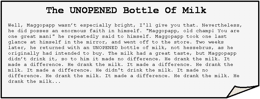 Two weeks later, he returned with an UNOPENED bottle of milk, not hessebrus,