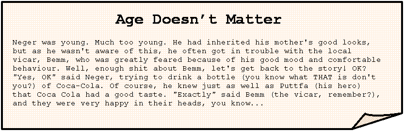 Age Doesn’t Matter Neger was young. Much too young. He had inherited his mother's good looks, but as he wasn't aware of this, he often got in trouble with the local vicar, Bemm, who was greatly feared because of his good mood and comfortable behaviour. Well, enough shit about Bemm, let's get back to the story! OK? "Yes, OK" said Neger, trying to drink a bottle (you know what THAT is don't you?) of Coca-Cola. Of course, he knew just as well as Puttfa (his hero) that Coca Cola had a good taste. "Exactly" said Bemm (the vicar, remember?), and they were very happy in their heads, you know... |