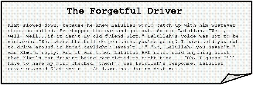 The Forgetful Driver Klæt slowed down, because he knew Lalullah would catch up with him whatever stunt he pulled. He stopped the car and got out. So did Lalullah. "Well, well, well...if it isn’t my old friend Klæt!" Lalullah’s voice was not to be mistaken: "So, where the hell do you think you’re going? I have told you not to drive around in broad daylight? Haven’t I?" "No, Lalullah, you haven’t!" was Klæt’s reply. And it was true. Lalullah HAD never said anything about that Klæt’s car-driving being restricted to night-time...."Oh, I guess I’ll have to have my mind checked, then!", was Lalullah’s response. Lalullah never stopped Klæt again... At least not during daytime... |