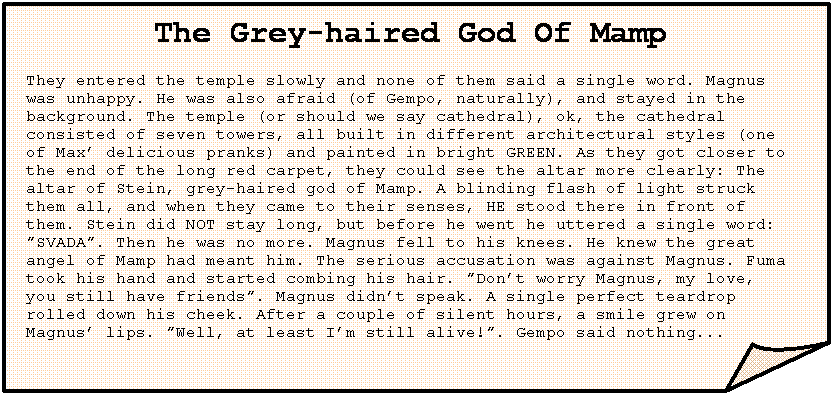 The Grey-haired God Of Mamp They entered the temple slowly and none of them said a single word. Magnus was unhappy. He was also afraid (of Gempo, naturally), and stayed in the background. The temple (or should we say cathedral), ok, the cathedral consisted of seven towers, all built in different architectural styles (one of Max’ delicious pranks) and painted in bright GREEN. As they got closer to the end of the long red carpet, they could see the altar more clearly: The altar of Stein, grey-haired god of Mamp. A blinding flash of light struck them all, and when they came to their senses, HE stood there in front of them. Stein did NOT stay long, but before he went he uttered a single word: ”SVADA”. Then he was no more. Magnus fell to his knees. He knew the great angel of Mamp had meant him. The serious accusation was against Magnus. Fuma took his hand and started combing his hair. ”Don’t worry Magnus, my love, you still have friends”. Magnus didn’t speak. A single perfect teardrop rolled down his cheek. After a couple of silent hours, a smile grew on Magnus’ lips. ”Well, at least I’m still alive!”. Gempo said nothing... |