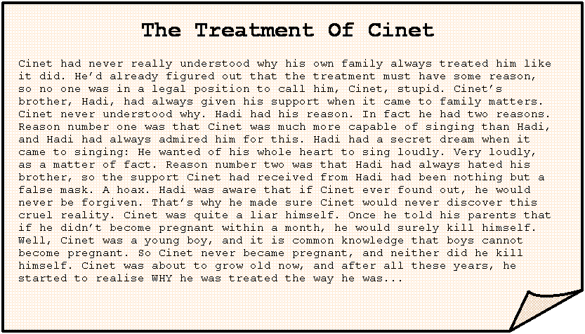The Treatment Of Cinet Cinet had never really understood why his own family always treated him like it did. He’d already figured out that the treatment must have some reason, so no one was in a legal position to call him, Cinet, stupid. Cinet’s brother, Hadi, had always given his support when it came to family matters. Cinet never understood why. Hadi had his reason. In fact he had two reasons. Reason number one was that Cinet was much more capable of singing than Hadi, and Hadi had always admired him for this. Hadi had a secret dream when it came to singing: He wanted of his whole heart to sing loudly. Very loudly, as a matter of fact. Reason number two was that Hadi had always hated his brother, so the support Cinet had received from Hadi had been nothing but a false mask. A hoax. Hadi was aware that if Cinet ever found out, he would never be forgiven. That’s why he made sure Cinet would never discover this cruel reality. Cinet was quite a liar himself. Once he told his parents that if he didn’t become pregnant within a month, he would surely kill himself. Well, Cinet was a young boy, and it is common knowledge that boys cannot become pregnant. So Cinet never became pregnant, and neither did he kill himself. Cinet was about to grow old now, and after all these years, he started to realise WHY he was treated the way he was... |