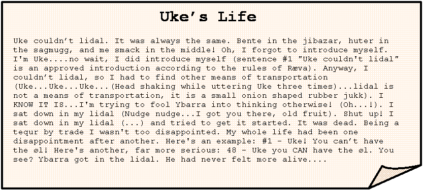 Uke’s Life Uke couldn’t lidal. It was always the same. Bente in the jibazar, huter in the sagmugg, and me smack in the middle! Oh, I forgot to introduce myself. I'm Uke....no wait, I did introduce myself (sentence #1 "Uke couldn't lidal" is an approved introduction according to the rules of Ræva). Anyway, I couldn’t lidal, so I had to find other means of transportation (Uke...Uke...Uke...(Head shaking while uttering Uke three times)...lidal is not a means of transportation, it is a small onion shaped rubber jukk). I KNOW IT IS...I'm trying to fool Ybarra into thinking otherwise! (Oh...!). I sat down in my lidal (Nudge nudge...I got you there, old fruit). Shut up! I sat down in my lidal (...) and tried to get it started. It was dead. Being a tequr by trade I wasn't too disappointed. My whole life had been one disappointment after another. Here's an example: #1 - Uke! You can’t have the øl! Here's another, far more serious: 48 - Uke you CAN have the øl. You see? Ybarra got in the lidal. He had never felt more alive.... |