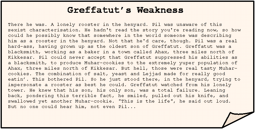 Greffatut’s Weakness There he was. A lonely rooster in the henyard. Pil was unaware of this sexist characterisation. He hadn't read the story you're reading now, so how could he possibly know that somewhere in the world someone was describing him as a rooster in the henyard. Not that he'd care, though. Pil was a real hard-ass, having grown up as the oldest son of Greffatut. Greffatut was a blacksmith, working as a baker in a town called Ahax, three miles north of Kikkesar. Pil could never accept that Greffatut suppressed his abilities as a blacksmith, to produce Muhar-cookies to the extremely yuper population of Ahax, three miles north of Kikkesar. But hell, those were real tasty Muhar-cookies. The combination of salt, yeast and Lejjad made for really good eatin’. This bothered Pil. So he just stood there, in the henyard, trying to impersonate a rooster as best he could. Greffatut watched from his lonely tower. He knew that his son, his only son, was a total failure. Leaning back, pondering this terrible fact, he smiled, pulled out his knife, and swallowed yet another Muhar-cookie. "This is the life", he said out loud. But no one could hear him, not even Pil... |