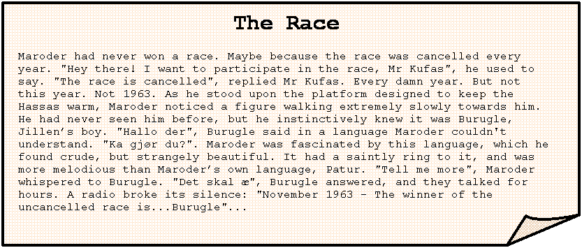 The Race Maroder had never won a race. Maybe because the race was cancelled every year. "Hey there! I want to participate in the race, Mr Kufas", he used to say. "The race is cancelled", replied Mr Kufas. Every damn year. But not this year. Not 1963. As he stood upon the platform designed to keep the Hassas warm, Maroder noticed a figure walking extremely slowly towards him. He had never seen him before, but he instinctively knew it was Burugle, Jillen’s boy. "Hallo der", Burugle said in a language Maroder couldn't understand. "Ka gjør du?". Maroder was fascinated by this language, which he found crude, but strangely beautiful. It had a saintly ring to it, and was more melodious than Maroder’s own language, Patur. "Tell me more", Maroder whispered to Burugle. "Det skal æ", Burugle answered, and they talked for hours. A radio broke its silence: "November 1963 - The winner of the uncancelled race is...Burugle"... |