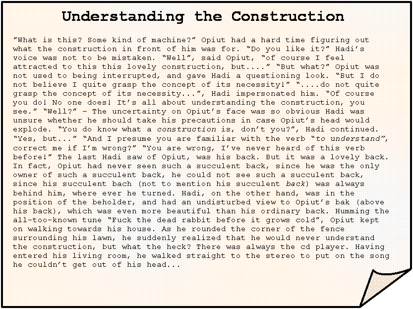 Understanding the Construction ”What is this? Some kind of machine?” Opiut had a hard time figuring out what the construction in front of him was for. “Do you like it?” Hadi’s voice was not to be mistaken. “Well”, said Opiut, “of course I feel attracted to this this lovely construction, but....” “But what?” Opiut was not used to being interrupted, and gave Hadi a questioning look. “But I do not believe I quite grasp the concept of its necessity!” “....do not quite grasp the concept of its necessity...”, Hadi impersonated him. “Of course you do! No one does! It’s all about understanding the construction, you see.” “Well?” – The uncertainty on Opiut’s face was so obvious Hadi was unsure whether he should take his precautions in case Opiut’s head would explode. “You do know what a construction is, don’t you?”, Hadi continued. “Yes, but...” “And I presume you are familiar with the verb “to understand”, correct me if I’m wrong?” “You are wrong, I’ve never heard of this verb before!” The last Hadi saw of Opiut, was his back. But it was a lovely back. In fact, Opiut had never seen such a succulent back, since he was the only owner of such a succulent back, he could not see such a succulent back, since his succulent bach (not to mention his succulent back) was always behind him, where ever he turned. Hadi, on the other hand, was in the position of the beholder, and had an undisturbed view to Opiut’s bak (above his back), which was even more beautiful than his ordinary back. Humming the all-too-known tune “Fuck the dead rabbit before it grows cold”, Opiut kept on walking towards his house. As he rounded the corner of the fence surrounding his lawn, he suddenly realized that he would never understand the construction, but what the heck? There was always the cd player. Having entered his living room, he walked straight to the stereo to put on the song he couldn’t get out of his head... |