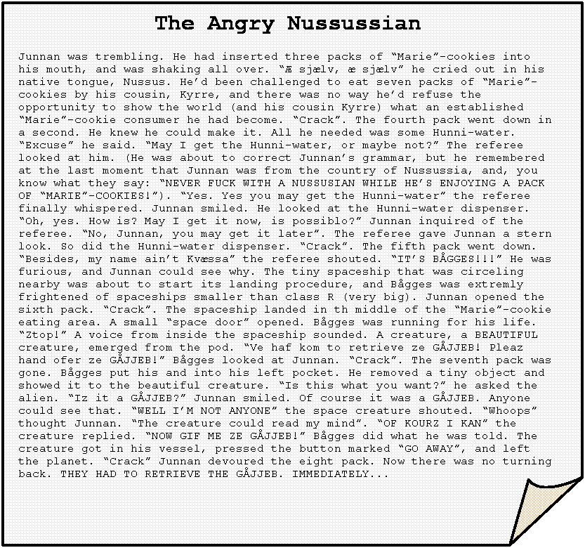 The Angry Nussussian Junnan was trembling. He had inserted three packs of “Marie”-cookies into his mouth, and was shaking all over. “Æ sjælv, æ sjælv” he cried out in his native tongue, Nussus. He’d been challenged to eat seven packs of “Marie”-cookies by his cousin, Kyrre, and there was no way he’d refuse the opportunity to show the world (and his cousin Kyrre) what an established “Marie”-cookie consumer he had become. “Crack”. The fourth pack went down in a second. He knew he could make it. All he needed was some Hunni-water. “Excuse” he said. “May I get the Hunni-water, or maybe not?” The referee looked at him. (He was about to correct Junnan’s grammar, but he remembered at the last moment that Junnan was from the country of Nussussia, and, you know what they say: “NEVER FUCK WITH A NUSSUSIAN WHILE HE’S ENJOYING A PACK OF “MARIE”-COOKIES!”). “Yes. Yes you may get the Hunni-water” the referee finally whispered. Junnan smiled. He looked at the Hunni-water dispenser. “Oh, yes. How is? May I get it now, is possiblo?” Junnan inquired of the referee. “No, Junnan, you may get it later”. The referee gave Junnan a stern look. So did the Hunni-water dispenser. “Crack”. The fifth pack went down. “Besides, my name ain’t Kvæssa” the referee shouted. “IT’S BÅGGES!!!” He was furious, and Junnan could see why. The tiny spaceship that was circeling nearby was about to start its landing procedure, and Bågges was extremly frightened of spaceships smaller than class R (very big). Junnan opened the sixth pack. “Crack”. The spaceship landed in th middle of the “Marie”-cookie eating area. A small “space door” opened. Bågges was running for his life. “Ztop!” A voice from inside the spaceship sounded. A creature, a BEAUTIFUL creature, emerged from the pod. “Ve haf kom to retrieve ze GÅJJEB! Pleaz hand ofer ze GÅJJEB!” Bågges looked at Junnan. “Crack”. The seventh pack was gone. Bågges put his and into his left pocket. He removed a tiny object and showed it to the beautiful creature. “Is this what you want?” he asked the alien. “Iz it a GÅJJEB?” Junnan smiled. Of course it was a GÅJJEB. Anyone could see that. “WELL I’M NOT ANYONE” the space creature shouted. “Whoops” thought Junnan. “The creature could read my mind”. “OF KOURZ I KAN” the creature replied. “NOW GIF ME ZE GÅJJEB!” Bågges did what he was told. The creature got in his vessel, pressed the button marked “GO AWAY”, and left the planet. “Crack” Junnan devoured the eight pack. Now there was no turning back. THEY HAD TO RETRIEVE THE GÅJJEB. IMMEDIATELY... |