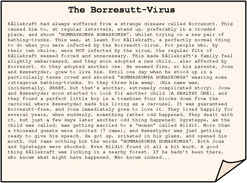 The Borresutt-Virus Rållekraft had always suffered from a strange disease called Borresutt. This caused him to, at regular intervals, stand up, preferably in a crowded place, and shout “HOMMASKOMPA HOMASKOMPA”, whilst trying on a new pair of bathing-trunks. This was, at least for Rållekraft, a perfectly normal thing to do when you were infected by the Borresutt-virus. For people who, by their own choice, were NOT infected by the virus, the regular fits of Rållekraft seemed forced and unnecessary. This made Rållekraft’s family feel slightly embarrassed, and they soon adopted a new child...also affected by Borresutt. So they adopted another one. He seemed fine, so his parents, Joxa and Bøssetyder, grew to live him. Until one day when he stood up in a particularly tense crowd and shouted “HOMMASKOMPA HOMASKOMPA” wearing some outrageous bathing-trunks. So they threw him away. (His name was, incidentally, ØRRET, but that’s another, extremely complicated story). Joxa and Bøssetyder soon started to look for another child (A HEALTHY ONE), and they found a perfect little boy in a trashcan four blocks down from the carnival where Bøssetyder made his living as a carousel. It was guaranteed Borresutt-free, and Joxa immediately grew to love it. They lived happily for several years, when suddenly, something rather odd happened. They dealt with it, but just a few days later another odd thing happened: Ugreteppe, as the child was called, was getting married to a “woman” called Hildit. More than a thousand guests were invited (7 came), and Bøssetyder was just getting ready to give his speech. He got up, urinated in his glass, and opened his mouth. Out came nothing but the words “HOMMASKOMPA HOMASKOMPA”. Both Joxa and Ugreteppe were shocked. Even Hildit found it all a bit much. A good thing Rållekraft was lurking in a nearby forest. If he hadn’t been there, who knows what might have happened. Who knows indeed... |