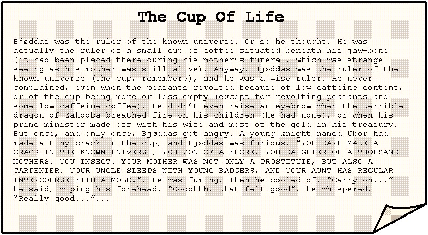The Cup Of Life Bjøddas was the ruler of the known universe. Or so he thought. He was actually the ruler of a small cup of coffee situated beneath his jaw-bone (it had been placed there during his mother’s funeral, which was strange seeing as his mother was still alive). Anyway, Bjøddas was the ruler of the known universe (the cup, remember?), and he was a wise ruler. He never complained, even when the peasants revolted because of low caffeine content, or of the cup being more or less empty (except for revolting peasants and some low-caffeine coffee). He didn’t even raise an eyebrow when the terrible dragon of Zahooba breathed fire on his children (he had none), or when his prime minister made off with his wife and most of the gold in his treasury. But once, and only once, Bjøddas got angry. A young knight named Ubor had made a tiny crack in the cup, and Bjøddas was furious. “YOU DARE MAKE A CRACK IN THE KNOWN UNIVERSE, YOU SON OF A WHORE, YOU DAUGHTER OF A THOUSAND MOTHERS. YOU INSECT. YOUR MOTHER WAS NOT ONLY A PROSTITUTE, BUT ALSO A CARPENTER. YOUR UNCLE SLEEPS WITH YOUNG BADGERS, AND YOUR AUNT HAS REGULAR INTERCOURSE WITH A MOLE!”. He was fuming. Then he cooled of. “Carry on...” he said, wiping his forehead. “Oooohhh, that felt good”, he whispered. “Really good...”... |