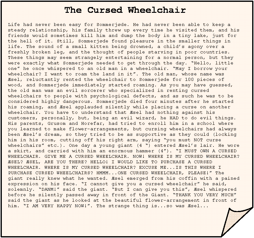 The Cursed Wheelchair Life had never been easy for Sommerjøde. He had never been able to keep a steady relationship, his family threw up every time he visited them, and his friends would sometimes kill him and dump the body in a tiny lake, just for the hell of it. Still, Sommerjøde found pleasure in the smaller things in life. The sound of a small kitten being drowned, a child’s agony over a freshly broken leg, and the thought of people starving in poor countries. These things may seem strangely entertaining for a normal person, but they were exactly what Sommerjøde needed to get through the day. “Hello, little one” he once whispered to an old man in a wheelchair. “May I borrow your wheelchair? I want to roam the land in it”. The old man, whose name was Æsel, reluctantly rented the wheelchair to Sommerjøde for 100 pieces of wood, and Sommerjøde immediately started roaming. As you may have guessed, the old man was an evil sorcerer who specialized in renting cursed wheelchairs to people with psychological defects, and as such he was to be considered highly dangerous. Sommerjøde died four minutes after he started his roaming, and Æsel applauded silently while placing a curse on another wheelchair. You have to understand that Æsel had nothing against his customers, personally, but, being an evil wizard, he HAD to do evil things. His parents, Grusom and Horefar, had tried to enroll him in a school where you learned to make flower-arrangements, but cursing wheelchairs had always been Æsel’s dream, so they tried to be as supportive as they could (locking him in his room, cutting off his right arm, saying “you must NOT curse wheelchairs” etc.). One day a young giant (4 “) entered Æsel’s lair. He wore a skirt, and carried with him an enormous hammer (4”). “I MUST OWN A CURSED WHEELCHAIR. GIVE ME A CURSED WHEELCHAIR. NOW! WHERE IS MY CURSED WHEELCHAIR? ÆSEL? ÆSEL, ARE YOU THERE? HELLO! I WOULD LIKE TO PURCHASE A CURSED WHEELCHAIR. WHERE IS MY CURSED WHEELCHAIR? EXCUSE ME...IS THIS WHERE I PURCHASE CURSED WHEELCHAIRS? HMMM...ONE CURSED WHEELCHAIR, PLEASE!” The giant really knew what he wanted. Æsel emerged from his coffin with a pained expression on his face. “I cannot give you a cursed wheelchair” he said, solemnly. “DANM!” said the giant. “But I can give you this”, Æsel whispered before he silently passed away in front of the Giant. “THANK YOU VERY MUCH” said the giant as he looked at the beautiful flower-arrangement in front of him. “I AM VERY HAPPY NOW!”. The strange thing is...so was Æsel... |